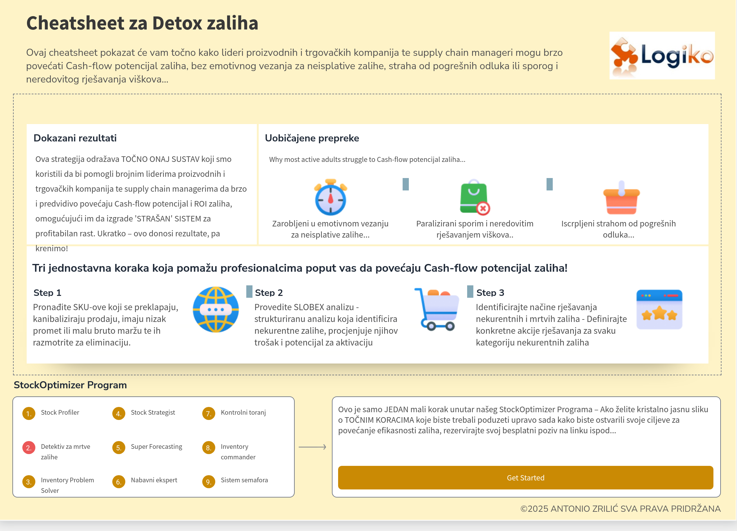"Kreirao sam ovaj program da pomognem supply chain menadžerima, direktorima i poduzetnicima u trgovačkim i proizvodnim poduzećima da brzo postignu vrhunske rezultate uz istovremenu uspostavu ovog 'STRAŠNOG' SISTEMA za kontrolu zaliha - bez nekontroliranog gomilanja nekurentnih zaliha, grešaka i nekompetentnosti, ili frustracije zbog kompleksnosti i operativne nejasnoće..