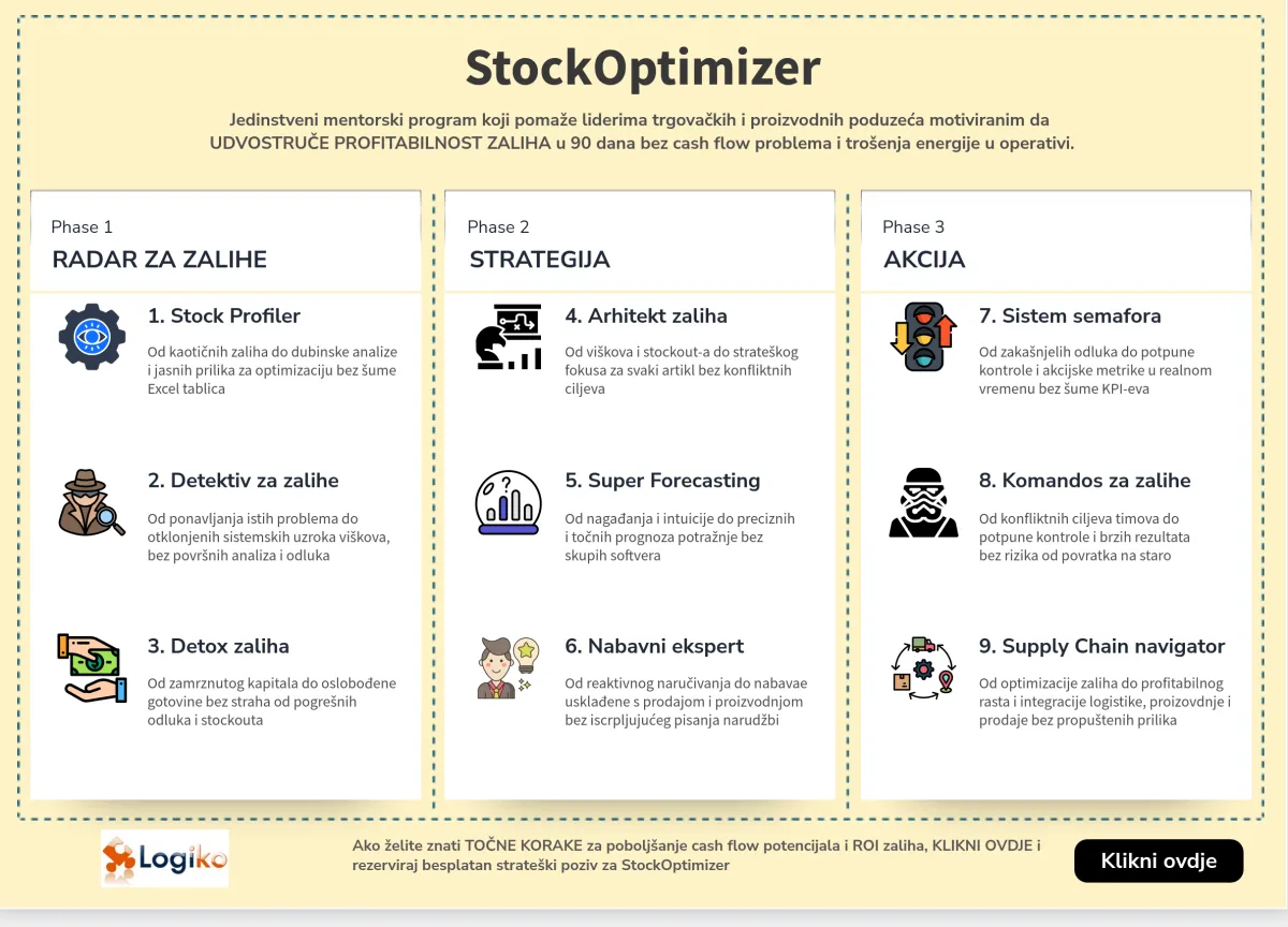 Jedinstveni mentorski program koji pomaže liderima trgovačkih i proizvodnih poduzeća motiviranih da UDVOSTRUČE PROFITABILNOST ZALIHA u 90 dana bez cash flow problema i trošenja energije u operativi.